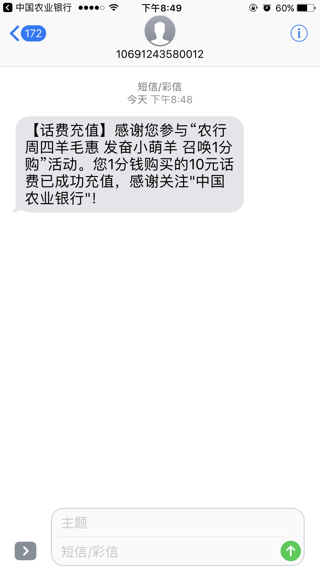 就是之前的周四的薅羊毛活动,你打开农行app,搜索 羊毛,跳出界面下拉的最低的一分钱购话费,这里进去耐心等候下,输入手机号,还有你当初设置的7位数兑换密码,拉下窗口图片验证,就ok了,然后话费到到账了